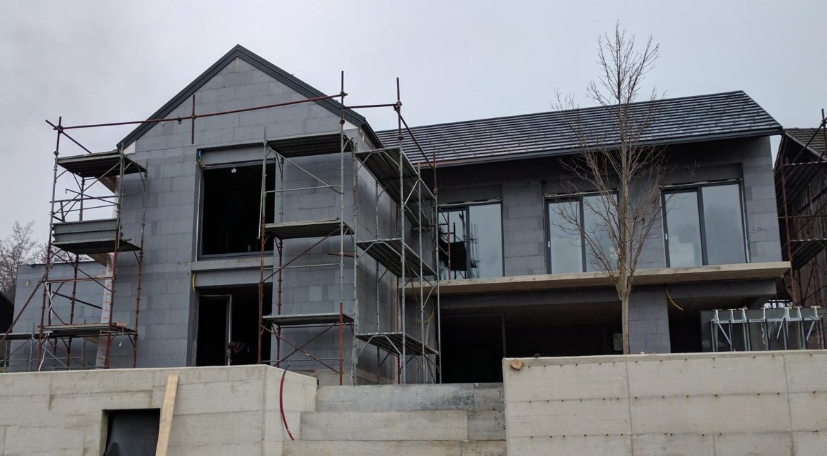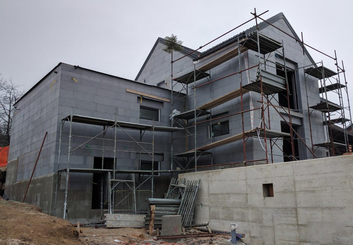 Pasivna hiša pri Grosupljem je pokrita, nadaljuje se montaža stavbnega pohištva, delo na strojnih inštalacijah in predelnih stenah.